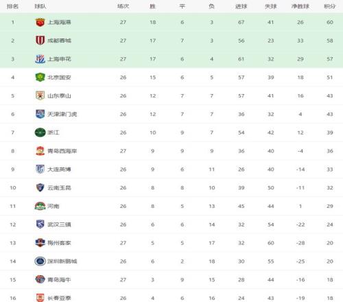 随着海港43,蓉城31,申花21,中超最新积分榜出炉:冠军难定
