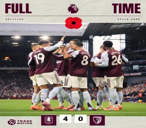 英超第11轮,阿斯顿维拉主场迎战伯恩茅斯。第28分钟,布恩迪亚禁区前沿任意球直接破门。第40分钟,阿马杜·奥纳纳远射扩大比分。第64分钟,罗杰斯手球送点,埃米利亚诺·马丁内斯神勇扑出塞梅尼奥点球。第77分钟,巴克利前点接迪涅右路角球,头球后蹭破门。第82分钟,马伦禁区前沿低射折射入网。维拉4比0大胜,18分暂列第7。樱桃军团遭遇自5月以来首次联赛连败,5月先输维拉后负曼城,11月先输蓝月再负维拉。
