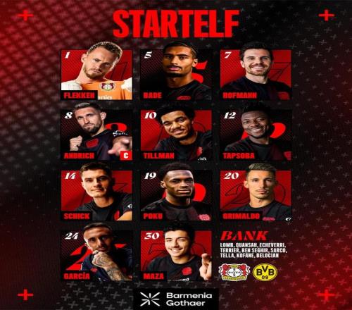 北京时间11月30日1:30,德甲第12轮继续进行,勒沃库森坐镇拜耳竞技场迎战多特蒙德,本场主裁判为托比亚斯-韦尔茨,赛前双方首发出炉。