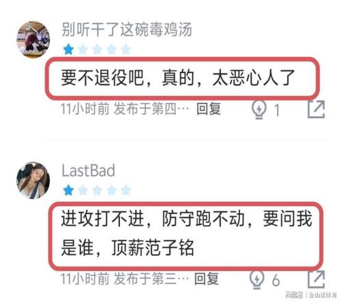 拿着顶薪的范子铭,近几个赛季不仅毫无进步,反而在场上表现得越来越拉胯,越来越“坑爹”,对此,球迷们也是大失所望,纷纷在网络平台吐槽“休赛期为什么不把他运作走?”;“番薯铭的称号一直没摘下,反而越来越稳定了”;“最垃圾的顶薪的了吧”;“平均上场1分钟,就输2分。”;“进攻打不进,防守跑不动,要问我是谁,顶薪范子铭”;“要不退役吧,真的,太恶心人了”……