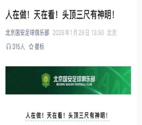 紧接着了,北京国安在官微上发文:“人在做,天在看!头顶三尺有神明!”。此举欲言又止,大有想说什么又什么都没说的味道。